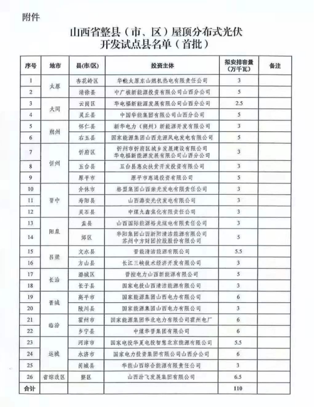山西省首批光伏整縣推進名單共涉及26個縣(市、區(qū)),規(guī)??傆嫗?.1GW,且所有試點縣均明確了項目投資主體,全部為國有企業(yè)。從規(guī)模來看,山西整縣推進試點項目主要集中在30~50MW,個別較高的縣達到了65MW。