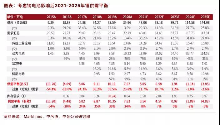 ▲ 考慮鈉電池影響后2021-2025年鋰供需平衡