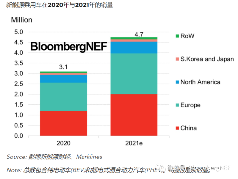 新能源乘用車2021年的全球銷量將超過470萬輛,較2020年提升約53%。彭博新能源財(cái)經(jīng)表示,在我們密切關(guān)注的所有地區(qū),新能源汽車的銷量都會(huì)出現(xiàn)成長(zhǎng),而中國(guó)和歐洲將繼續(xù)貢獻(xiàn)全球銷量的主要部分。
