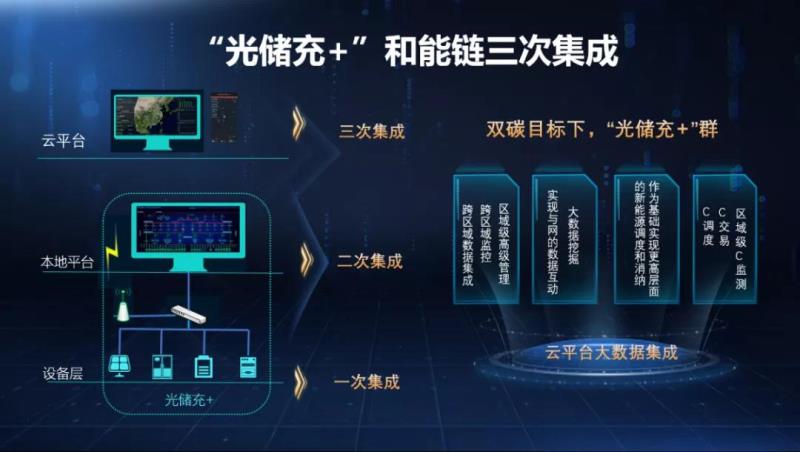 領(lǐng)充創(chuàng)新提出了對(duì)設(shè)備層、本地平臺(tái)、云平臺(tái)的三次集成技術(shù),創(chuàng)建了“光儲(chǔ)充+”群的統(tǒng)籌管理體系。在設(shè)備層實(shí)現(xiàn)一次集成;通過(guò)站控層實(shí)現(xiàn)本地平臺(tái)可視可控,建立能源智慧管理系統(tǒng),完成二次集成;通過(guò)云平臺(tái),進(jìn)行三次集成,實(shí)現(xiàn)跨區(qū)域能源調(diào)度。
