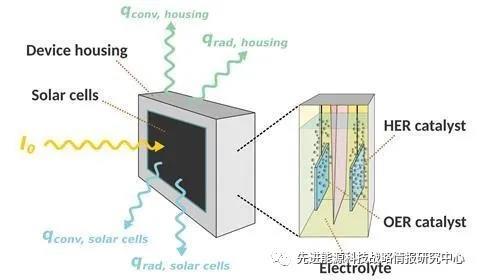 當(dāng)前,大規(guī)模水解制氫技術(shù)通常在50-1000℃下運行,太陽能水解的實驗研究通常采用約20℃的環(huán)境溫度。然而,小型分布式制氫需考慮室外溫度對設(shè)備運行的影響,例如為高海拔地區(qū)氣象站供電。在沒有外部加熱的情況下,設(shè)備的過程溫度將非常接近環(huán)境溫度。低電解質(zhì)溫度會導(dǎo)致更高的催化和離子傳輸過電位的損失,也會導(dǎo)致電解質(zhì)出現(xiàn)冷凍現(xiàn)象,使得制氫過程停止,冷凍后的體積膨脹也會損壞反應(yīng)設(shè)備。研究人員采用了低凝固點電解質(zhì)(如稀硫酸),以便在較低的溫度下使用。同時,通過熱耦合(利用太陽能電池產(chǎn)生的熱量)和設(shè)備隔熱來補償由于低工作溫度導(dǎo)致的效率損失。研究人員利用數(shù)值模型研究了低溫對太陽能水分解裝置效率的影響,并定量分析了熱耦合和隔熱裝置的影響。結(jié)果顯示,低溫將導(dǎo)致電化學(xué)組件的催化性能降低,歐姆損失增加,但另一方面會提升太陽能電池的效率。為了衡量兩種相反的效應(yīng),研究人員開發(fā)了一個開源模型,結(jié)合了太陽能電池參數(shù)、電化學(xué)參數(shù)以及熱通量,根據(jù)太陽能電池和催化劑的溫度相關(guān)電流-電壓特性預(yù)測太陽能到氫氣(STH)的轉(zhuǎn)換效率。隨后,針對由高效雙結(jié)或三結(jié)III–V族太陽能電池和電解水制氫(析氧和析氫催化劑分別為鉑<Pt>和銥氧化物<IrOx>)組成的裝置進行了計算,使用凝固點為-35℃、濃度30wt%的稀硫酸(H2SO4)作為電解質(zhì)。結(jié)果顯示,隨著室外溫度降低,基于雙結(jié)太陽能電池的無熱耦合系統(tǒng)STH效率先升高后降低;基于三結(jié)太陽能電池的系統(tǒng)STH效率穩(wěn)定下降;同等環(huán)境下采用熱耦合設(shè)計將STH效率提升了6%。進一步地,研究人員計算了設(shè)備隔熱對STH效率的影響。模型中通過鋁箔減少輻射損失,采用聚苯乙烯減少散熱。對于基于雙結(jié)太陽能電池的系統(tǒng),隔熱對隨溫度降低STH效率升高的階段有負面影響,對隨溫度降低STH效率降低的階段有正面影響;對基于三結(jié)太陽能電池的系統(tǒng),隔熱始終有正面影響?;跀?shù)值模擬結(jié)果,研究人員在實驗室條件下進行了驗證。基于商用三結(jié)鎵銦磷/鎵銦砷/鍺(GaInP/GaInAs/Ge)太陽能電池和使用商用Pt和IrOx催化劑的電解器構(gòu)建了實驗裝置,在-20.5℃至-19.2℃的環(huán)境溫度、AM 1.5光照下運行了3小時,比較了無熱耦合、熱耦合系統(tǒng)和熱耦合/隔熱系統(tǒng)的工作電流、工作電壓和運行溫度。其中,電解器采用了新型的無膜概念,電極通過楔型塊分隔,產(chǎn)物利用浮力分離。由于運行中超過了熱中性電壓,無熱耦合系統(tǒng)的電解質(zhì)溫度僅略微升高,而太陽能電池溫度升高,降低了開路電位,因此工作電位略有增加并超過太陽能電池的最大功率點(MPP),導(dǎo)致工作電流急劇下降。而熱耦合系統(tǒng)和熱耦合/隔熱系統(tǒng)的電解液溫度分別達到-4.5℃和13.5℃,其對轉(zhuǎn)換效率的影響超過了太陽能電池的效率損失,工作電流增加,工作電位降低。根據(jù)實驗結(jié)果可得出,三種設(shè)計下的STH效率分別達到10.3%、11.2%和11.4%。