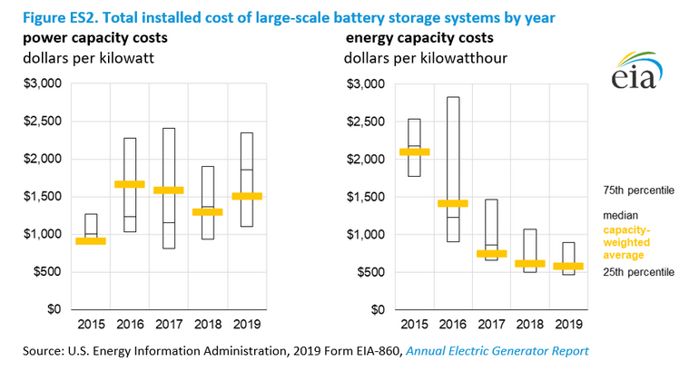 中國儲能網訊:據外媒報道,美國能源部下屬的美國能源信息署(EIA)日前在發(fā)布的一份調查報告中預測,由于2015年到2019年期間電池儲能成本下降了72%,美國公用事業(yè)公司將在未來兩年內為電網采購或部署裝機容量為10GW電池儲能系統(tǒng)。