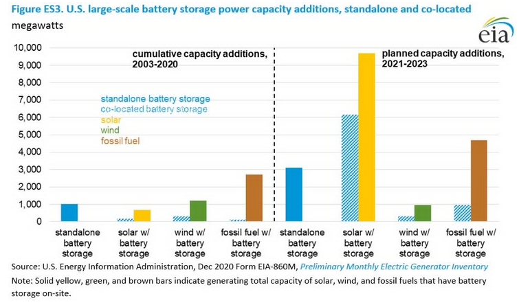 共址部署的太陽能發(fā)電設施和電池儲能項目數量預計將顯著增長。事實上,這是美國能源信息署(EIA)最為確定的對于目前到2023年儲能市場的發(fā)展趨勢。報告指出,美國計劃建設約100個配套部署電池儲能系統(tǒng)的太陽能發(fā)電設施,電池儲能項目的總裝機容量為7,689MW,而獨立部署的59座儲能系統(tǒng)的總裝機容量為3,115MW。