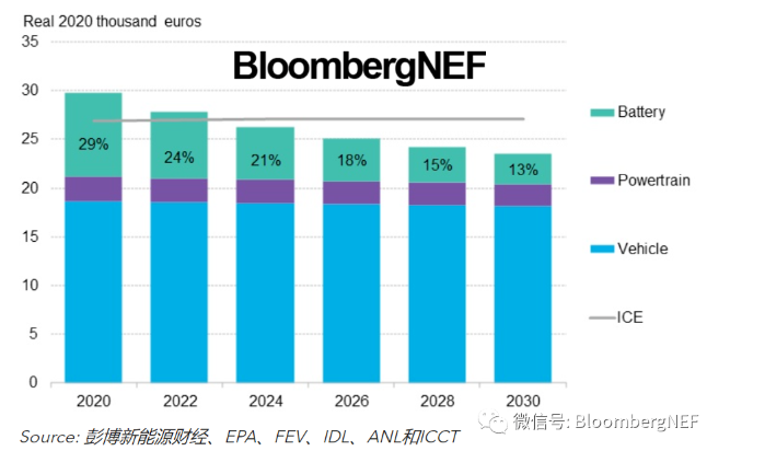 歐洲的大型車(chē)、美國(guó)的大型車(chē)和SUV等車(chē)型價(jià)格更高的細(xì)分領(lǐng)域最早有望在2023年實(shí)現(xiàn)平價(jià)。根據(jù)細(xì)分領(lǐng)域不同,電池占總制造成本的比重將在2023-2027年降至20%。