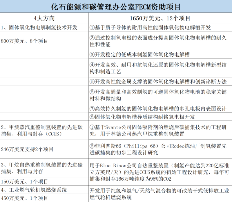 化石能源和碳管理辦公室(FECM)項(xiàng)目則建立在現(xiàn)有工業(yè)基礎(chǔ)上,從固體氧化物、甲烷重整制氫、工業(yè)氫燃燒系統(tǒng)方向出發(fā),實(shí)現(xiàn)能源轉(zhuǎn)型和氫能工業(yè)化探索。其中固體氧化物電解制氫技術(shù)(SOEC)開(kāi)發(fā)方向引發(fā)關(guān)注,資助總額和項(xiàng)目個(gè)數(shù)占據(jù)FECM領(lǐng)導(dǎo)項(xiàng)目的大壁江山,可以窺見(jiàn)美國(guó)拿下SOEC研發(fā)板塊的決心。