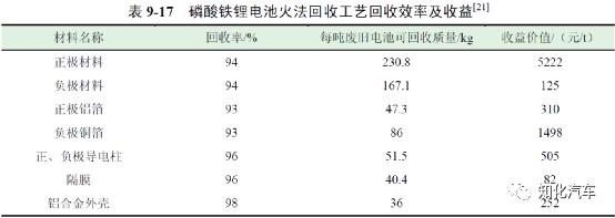 此外,三元材料電池和磷酸鐵鋰電池火法回收工藝回收效率及收益如表9-16 和表9-17 所示。從以上數(shù)據(jù)可以得知采用火法回收工藝回收每噸三元電池的平均收益為17405 元,回收每噸磷酸鐵鋰電池的平均收益為7994 元。因此,采用火法回收工藝每回收一噸三元電池將盈利3015 元,每回收一噸磷酸鐵鋰電池將虧損1496 元。
