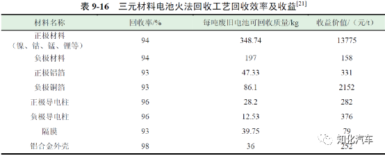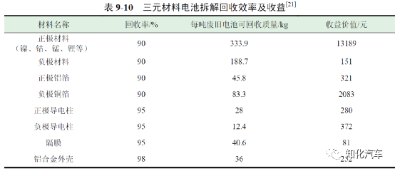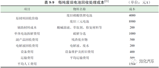 陶志軍和賈曉峰通過對北京賽德美動力電池回收產(chǎn)業(yè)的調(diào)研,發(fā)現(xiàn)動力電池回收過程中,成本主要集中在原材料回收、電池拆解預(yù)處理、廢水廢棄物處理、人工費(fèi)用等階段,表9-9 為每噸廢舊電池回收處理成本。其中,廢舊三元電池平均回收費(fèi)用為8900 元/t,經(jīng)過梯次利用之后且質(zhì)量較差的磷酸鐵鋰電池平均回收費(fèi)用為4000 元/t。從調(diào)研數(shù)據(jù)可以看出,回收及拆解每噸三元電池的平均成本為13264 元,回收及拆解每噸磷酸鐵鋰電池的平均成本為8364 元,動力電池內(nèi)富含的大量的有價金屬是電池回收主要的收益來源,特別是近年來鎳、鈷、錳、鋰等金屬材料價格的上漲對動力電池拆解回收領(lǐng)域起到了巨大的促進(jìn)作用。