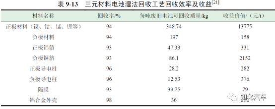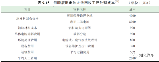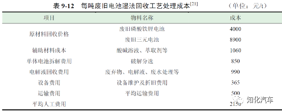 濕法回收工藝的成本主要來源于原材料回收成本、廢水廢棄物處理等方面,表9-12 為每噸廢舊電池濕法回收工藝處理成本。濕法回收工藝每處理一噸三元電池的平均成本為14815 元,每處理一噸磷酸鐵鋰電池的平均成本為9915 元。此外,采用濕法回收工藝對電池有價值材料回收的效率較高,因此收益情況也更明顯。