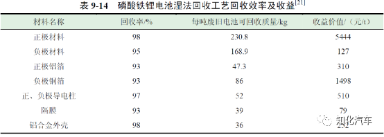 表9-13 和表9-14 為材料電池和磷酸鐵鋰電池濕法回收工藝回收效率及收益。通過以上數(shù)據(jù),得到采用濕法回收工藝回收每噸三元電池的平均收益為18073 元,回收每噸磷酸鐵鋰電池的平均收益為8220 元。因此,采用濕法回收工藝每回收一噸三元電池將盈利3258 元,每回收一噸磷酸鐵鋰電池將虧損1695 元。