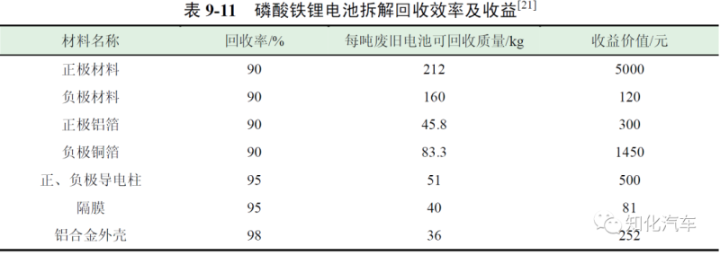 表9-10 為三元材料電池拆解回收效率及收益。每噸三元材料電池經(jīng)拆解后回收有價值金屬和材料的平均收益為16728 元。此外,經(jīng)過調(diào)研,對磷酸鐵鋰電池拆解收益情況也進(jìn)行了分析,磷酸鐵鋰電池拆解回收效率及收益如表9-11 所示。拆解每噸磷酸鐵鋰電池回收有價金屬和材料的收益約為7703 元。從前面分析數(shù)據(jù)可以看出,采用物理法回收每噸三元材料電池的拆解成本為13264 元,通過銷售拆解后得到的有價值材料獲得的收益為16728 元,因此,拆解回收每噸三元電池可盈利3464元;而每噸磷酸鐵鋰電池拆解成本為8364 元,收益為7703 元,因此拆解回收每噸磷酸鐵鋰電池將虧損661 元。