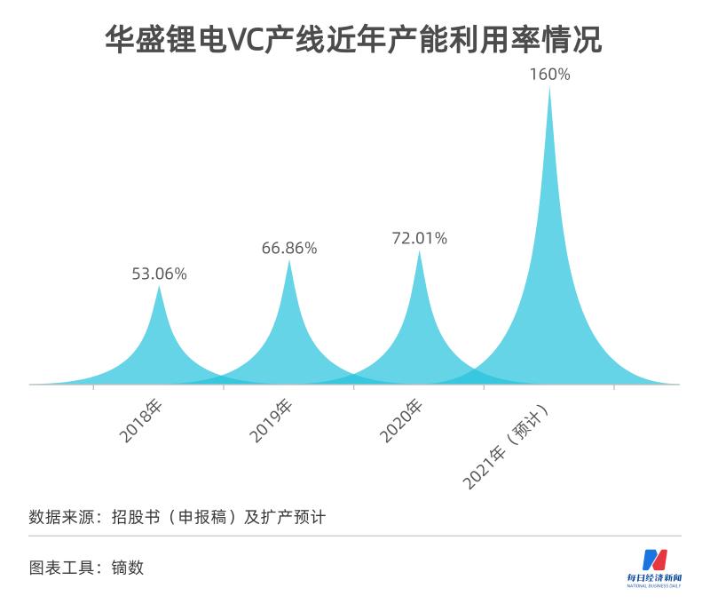 2018年~2020年,華盛鋰電VC產(chǎn)品產(chǎn)能利用率分別為53.06%、66.86%和72.01%。由此可見(jiàn),在磷酸鐵鋰電池低迷之際,VC產(chǎn)品呈現(xiàn)出產(chǎn)能過(guò)剩的情況,一度產(chǎn)能利用率剛剛過(guò)半。而以400噸/月產(chǎn)量計(jì)算,2021年華盛鋰電VC產(chǎn)品產(chǎn)能利用率將達(dá)到160%。