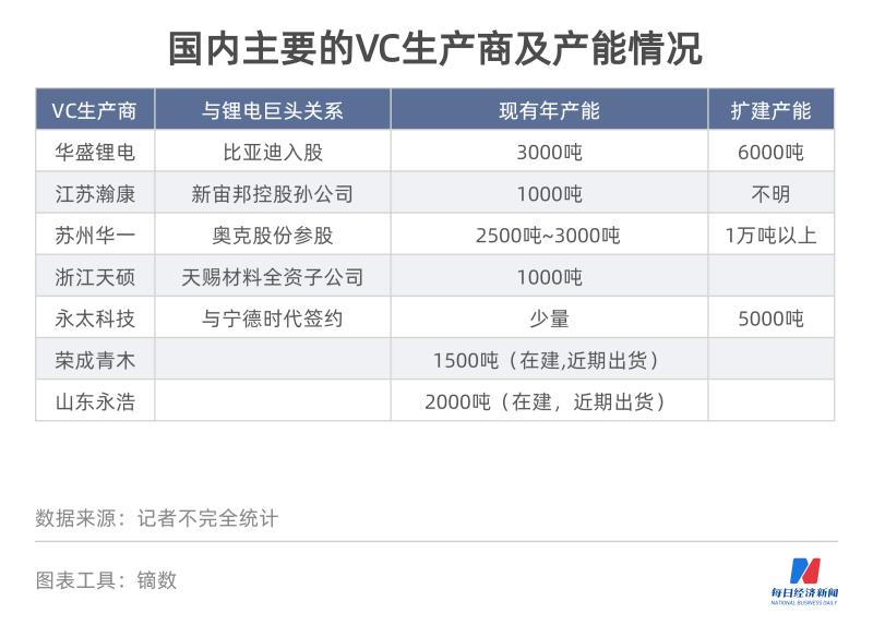 根據(jù)頭豹研究院提供的數(shù)據(jù),目前中國(guó)VC溶劑整體供給量有限,但各大廠商均在積極擴(kuò)產(chǎn)。比亞迪通過(guò)投資華盛鋰電,從而獲得大量VC產(chǎn)能,而寧德時(shí)代則選擇與永太科技合作,對(duì)舊產(chǎn)線進(jìn)行改造。