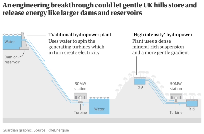 但是,這個“水電工程”實際上不是用的不是水,而是使用一種高密度的流體,其密度是水的兩倍半以上,因此可以儲存更多的電能。推動這個項目的公司RheEnergise表示,在電力需求較低的時候,該項目將把高密度液體泵到200米的山上,存放在一個比奧運會游泳池還大的地下儲水池里。然后,當需要額外的電力時,這些液體就會回流通過渦輪機發(fā)電,向電網供電。