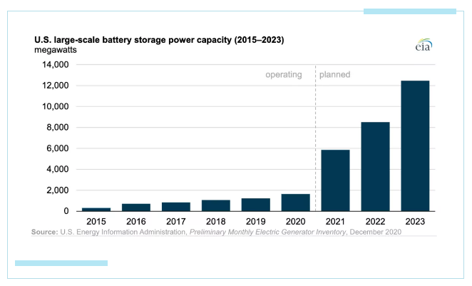 根據(jù)美國能源信息署的數(shù)據(jù),2020年美國的大規(guī)模電池存儲(chǔ)容量繼續(xù)保持顯著增長趨勢(shì),美國電池容量在2020年增長了35%,達(dá)到1650兆瓦。在過去5年中美國電池儲(chǔ)能容量已經(jīng)增長了三倍,這一趨勢(shì)預(yù)計(jì)將繼續(xù)下去,在2021年至2023年期間美國可新增10000兆瓦以上的大型電池儲(chǔ)能,是2019年容量的10倍。