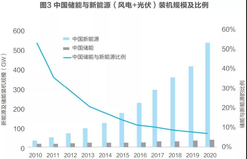 截至2020年底,我國發(fā)電裝機容量約2200GW,其中火電裝機占比56.6%,水電16.8%,風電12.8%,光伏發(fā)電11.5%,核電2.3%。發(fā)電量方面,2020年全國發(fā)電量約760萬GWh,其中風電貢獻46.65萬GWh,光伏發(fā)電26.11GWh,風電和光伏發(fā)電量一共占比不到10%。如果將儲能裝機規(guī)模與發(fā)電裝機容量進行比較,2020年該比例約1.59%。