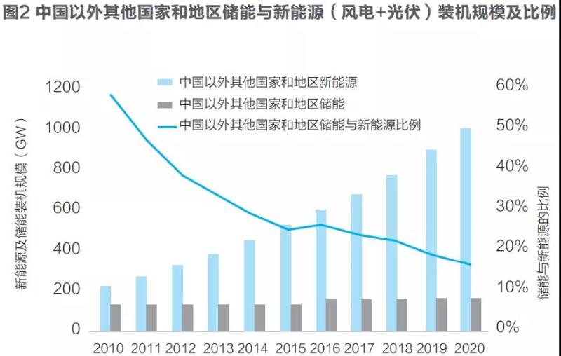 儲能是解決高比例新能源并網(wǎng)消納的重要支撐,儲能產(chǎn)業(yè)的發(fā)展得到了高度重視。近年來中國及全球儲新比數(shù)據(jù)的下降幅度都已經(jīng)明顯趨緩;考慮儲能技術的發(fā)展和市場需求,預計中國以外世界其他國家和地區(qū)的儲新比有可能在2024年左右達到最低值,預計為13-15%左右,之后趨于穩(wěn)定或略有回升。假設全球風電和光伏裝機按照平均每年10%的增速發(fā)展,到2030年累計裝機將達3900GW;而全球儲能裝機規(guī)模若按13-15%的比例計算,2030年將達507-585GW的規(guī)模(截至2020年底為192.2GW)。