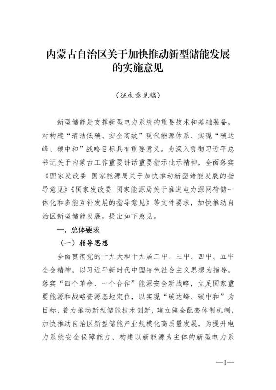 關(guān)于對(duì)《內(nèi)蒙古自治區(qū)關(guān)于加快推動(dòng)新型儲(chǔ)能發(fā)展的實(shí)施意見(jiàn)(征求意見(jiàn)稿)》公開(kāi)征求意見(jiàn)的公告