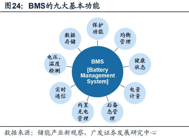 電池管理系統(tǒng)(BMS)主要作用在于對電池狀態(tài)進(jìn)行檢測。原材料主要包括芯 片、線束、繼電器和機(jī)殼,由主控單元、從控單元、信息采集單元、信息傳輸及顯 示單元等組成?;竟ぷ髟頌镸CU采集傳感器提供的電流、電壓、溫度等電池工 作參數(shù),從而對電池的工作情況進(jìn)行分析,估算其剩余電量決定是否啟動保護(hù)電路 或進(jìn)行均衡;同時(shí)電池工作狀態(tài)可通過顯示屏顯示,也可以與互聯(lián)網(wǎng)進(jìn)行通信,從 而實(shí)現(xiàn)遠(yuǎn)程監(jiān)控。在鋰離子電池系統(tǒng)中,BMS需要對電池組進(jìn)行數(shù)據(jù)監(jiān)測和故障診 斷,以便對電池進(jìn)行動態(tài)管理,主要包括實(shí)現(xiàn)單體電池電壓電流檢測、電量計(jì)算、 均衡管理等九大功能,其中電流電壓、溫度和單體電芯容量管理(SOC)直接決定 電池組的壽命與安全性,是BMS的關(guān)鍵環(huán)節(jié)。