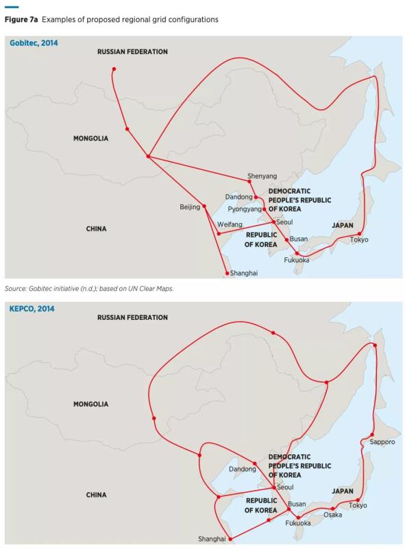 IRENA的報(bào)告綜述了中、俄、蒙、朝、韓、日電力聯(lián)網(wǎng)的4種不同方案,分別來自Gobitec、APERC、KEPCO和EDF。這些聯(lián)網(wǎng)方案有共同的特點(diǎn),但也存在重要的差異。所有倡議都包括從中國(guó)或俄羅斯聯(lián)邦經(jīng)朝鮮到韓國(guó)的走向。然而,朝鮮目前沒有參與規(guī)劃這些倡議,因此在其領(lǐng)土上引入輸電線路并不是基于當(dāng)前的政治現(xiàn)實(shí)。根據(jù)目前和預(yù)期的近中期情況,需要通過海底電纜規(guī)劃通往韓國(guó)的輸電線路,而通過朝鮮的輸電線可以繼續(xù)作為長(zhǎng)期愿景的一部分。