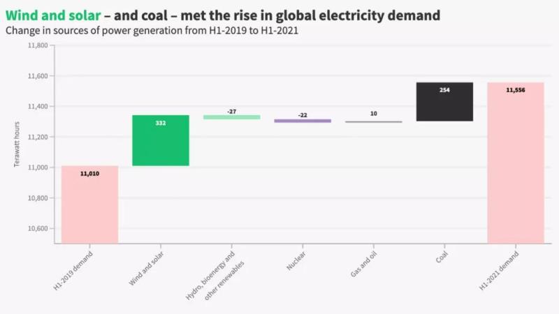 與疫情大流行前水平相比,2021年上半年全球電力需求增加了5%,主要由風(fēng)能和太陽(yáng)能(57%)滿足,但排放密集型煤電(43%)的增加也導(dǎo)致了二氧化碳排放量的增加。天然氣貢獻(xiàn)幾乎沒(méi)有變化,而水電和核能比例略有下降。風(fēng)能和太陽(yáng)能發(fā)電量首次超過(guò)全球發(fā)電量的十分之一,并超過(guò)了核能發(fā)電量。