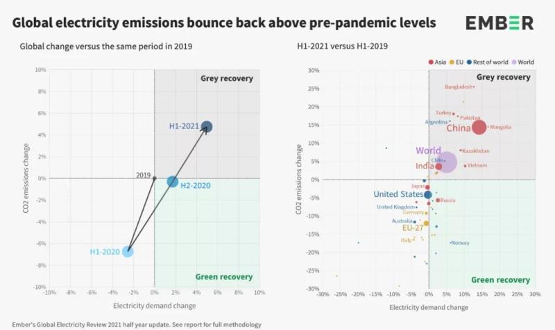 到目前為止,還沒(méi)有一個(gè)國(guó)家的電力部門實(shí)現(xiàn)了真正的“綠色復(fù)蘇”。包括美國(guó)、歐盟、日本和韓國(guó)在內(nèi)的幾個(gè)國(guó)家的電力部門二氧化碳排放量低于大流行前水平,但這只是在需求增長(zhǎng)受到抑制的情況下風(fēng)能和太陽(yáng)能部分取代了煤炭。在電力需求不斷增加的國(guó)家出現(xiàn)了更高的排放,原因是煤炭發(fā)電量增速超過(guò)了風(fēng)能和太陽(yáng)能。這些“灰色復(fù)蘇”國(guó)家大多在亞洲,包括:中國(guó)、孟加拉國(guó)、印度、哈薩克斯坦、蒙古、巴基斯坦和越南。