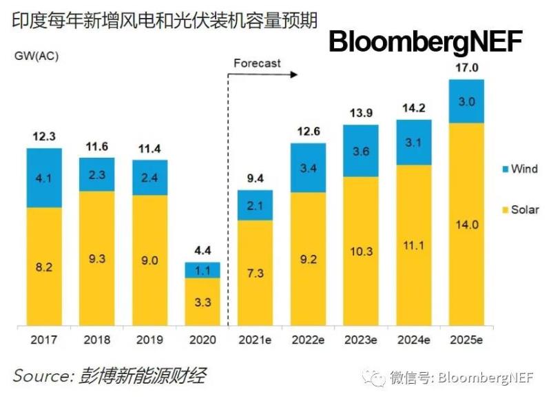 印度的可再生能源并網(wǎng)裝機容量在2021年8月已達100GW(不計入大型水電),這一數(shù)值在2015年底還不到40GW。由于2030年裝機容量目標是450GW,其中光伏和風(fēng)電的最低目標分別為280GW和140GW,這一增速需要得到維持。
