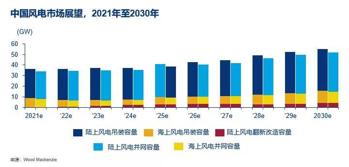 據(jù)伍德麥肯茲最新預(yù)計(jì),預(yù)計(jì)至2030年底,中國(guó)風(fēng)電市場(chǎng)的累計(jì)并網(wǎng)容量將達(dá)到689GW,占全球風(fēng)電累計(jì)并網(wǎng)容量的67%。預(yù)計(jì)2021-2030年,中國(guó)風(fēng)電新增并網(wǎng)裝機(jī)將達(dá)到408GW,以支持到2030年中國(guó)風(fēng)電與光伏總裝機(jī)容量達(dá)到1,200GW以上的目標(biāo)。