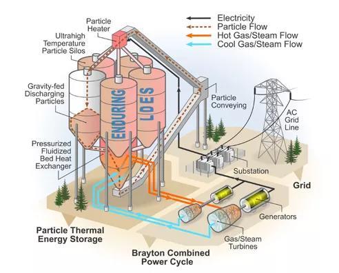 當(dāng)需要能量時,加熱的硅砂通過熱交換器重力供給,加熱和加壓內(nèi)部的工作氣體,以驅(qū)動渦輪機(jī)械和旋轉(zhuǎn)發(fā)電機(jī)從而為電網(wǎng)發(fā)電。該系統(tǒng)在高電力需求期間以及太陽能或風(fēng)能等有限的間歇性電源不可用時放電。