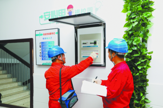 在浙江湖州市安吉縣實(shí)驗(yàn)初中,浙江安吉縣供電公司員工正在檢查學(xué)校用電設(shè)備。金瑋 攝