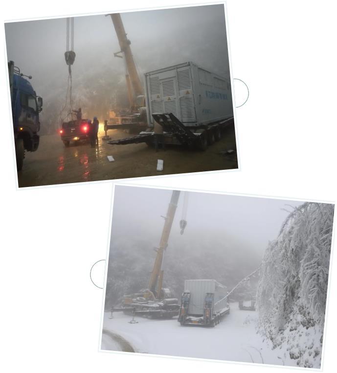 該儲(chǔ)能項(xiàng)目總規(guī)模10MW/20MWh,索英電氣提供4套2.5MW PCS升壓一體艙、能量管理系統(tǒng)等配套設(shè)施。進(jìn)行施工任務(wù)時(shí),正值寒冬11月份,冬天的大靈山時(shí)常大霧彌漫,給配送帶來(lái)極大挑戰(zhàn),山內(nèi)導(dǎo)航困難,山路蜿蜒難行,配送司機(jī)往往要不斷電話溝通確認(rèn)位置,如果碰到雨雪天氣,積雪封路,工程隊(duì)就在路面撒上融雪劑,等雪化了繼續(xù)趕路,“搶工期,搶工期,是當(dāng)時(shí)心里最重要的事情?!?/span>