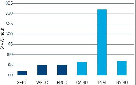 注:SERC、WECC、FRCC為北美可靠性管理委員會下屬的區(qū)域可靠性委員會管轄的垂直一體化地區(qū),儲能調(diào)頻收益基于固定價格確定,CAISO、PJM和NYISO為放開管制的電力市場,儲能收益基于市場競爭機制確定。