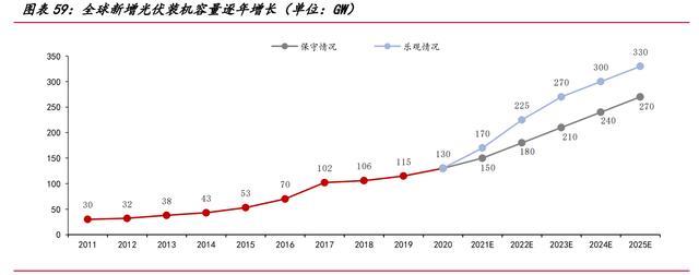 1)全球光伏新增裝機(jī)量:裝機(jī)量的預(yù)測(cè)以中國(guó)光伏行業(yè)協(xié)會(huì)在《2020中國(guó)光伏產(chǎn)業(yè)發(fā)展路線(xiàn)圖》中對(duì)于“保守情況”的指引為主要依據(jù),到2025年國(guó)內(nèi)新增光伏裝機(jī)量達(dá)到100GW左右,全球新增裝機(jī)接近300GW。