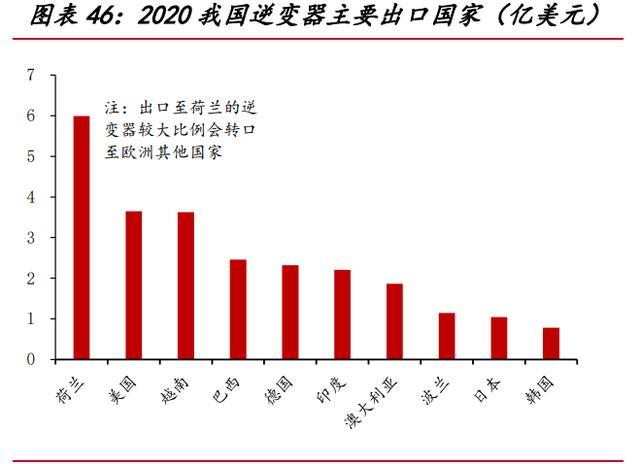 歐洲和亞洲是當(dāng)前我國(guó)逆變器出口最主要的市場(chǎng)。2020年,我國(guó)出口至歐洲和亞洲的逆變器總額分別為12.5和11.4億美元,同比增長(zhǎng)31.44%和43.43%;并且2021年前6個(gè)月對(duì)歐洲市場(chǎng)的出口額已經(jīng)達(dá)到9.2億美元,相當(dāng)于2019年全年的水平。2020年我國(guó)對(duì)北美地區(qū)的出口額下滑20.04%,主要受到了中美貿(mào)易糾紛的影響,部分企業(yè)通過(guò)在海外設(shè)立工廠(chǎng)以應(yīng)對(duì)此類(lèi)情況。