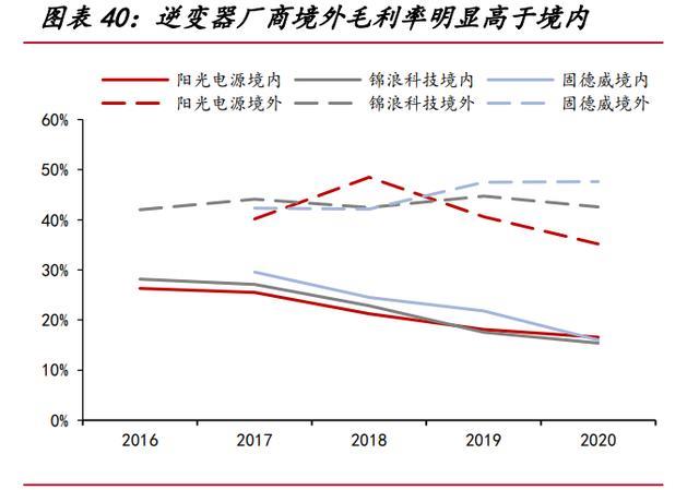 海外市場(chǎng)利潤(rùn)空間更大,國(guó)內(nèi)廠(chǎng)商加速海外滲透。國(guó)產(chǎn)逆變器在海外的售價(jià)高于國(guó)內(nèi),陽(yáng)光電源、錦浪科技和固德威在境外的毛利率分別為35.16%、42.58%和47.59%,均為境內(nèi)的2倍以上。利潤(rùn)驅(qū)動(dòng)下,國(guó)內(nèi)廠(chǎng)商的收入重心轉(zhuǎn)移至海外,錦浪科技和固德威境外收入占比均在60%以上;陽(yáng)光電源的境外收入占比近年來(lái)不斷提升,目前達(dá)到34.23%;上能電氣2018年以后注重海外業(yè)務(wù)的發(fā)展,取得了明顯的提升。