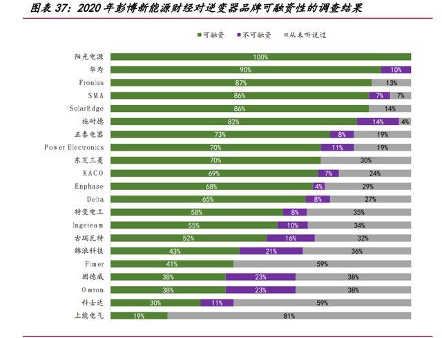 國(guó)內(nèi)廠(chǎng)商在海外品牌認(rèn)可度逐漸提升。2020年彭博新能源財(cái)經(jīng)通過(guò)向可再生能源項(xiàng)目的投資方發(fā)放問(wèn)卷等形式,對(duì)逆變器品牌的可融資性進(jìn)行了調(diào)查。排名較高的品牌意味著更易幫助項(xiàng)目開(kāi)發(fā)商獲得銀行融資,利于綁定長(zhǎng)期客戶(hù)群體;另一方面說(shuō)明該品牌逆變器在產(chǎn)品質(zhì)量、運(yùn)行表現(xiàn)、售后服務(wù)支持和長(zhǎng)期可靠性方面表現(xiàn)突出,利于海外布局的拓展。陽(yáng)光電源以100%的得票率當(dāng)選“全球最具融資價(jià)值的逆變器品牌”,華為位居第2名,共有9家中國(guó)企業(yè)上榜;顯示出國(guó)內(nèi)廠(chǎng)商在海外擴(kuò)張業(yè)務(wù)的過(guò)程中,品牌價(jià)值得到提升,逐漸得到海外投資方的認(rèn)可。