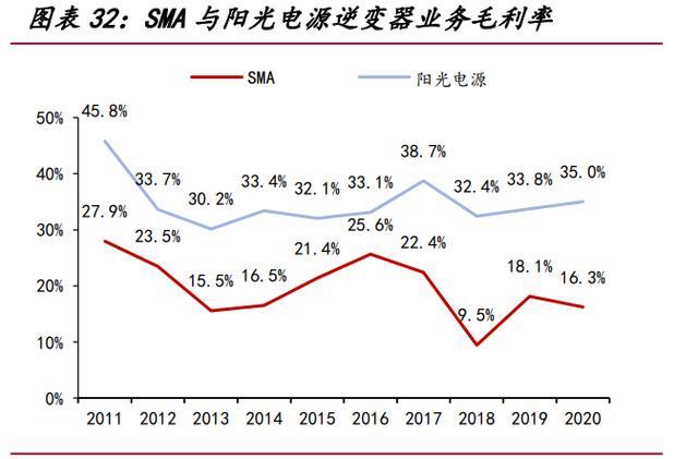 2017年以來(lái),隨著行業(yè)技術(shù)的不斷進(jìn)步,電子元器件產(chǎn)品的更新?lián)Q代速度加快,價(jià)格水平逐年下降,下游光伏逆變器企業(yè)的采購(gòu)成本也受益降低。以固德威為例,2017-2019年,公司功率器件、電感、電容和控制組件等電子元器件采購(gòu)單價(jià)基本均呈現(xiàn)不同幅度下滑,疊加國(guó)內(nèi)較低的人工成本,國(guó)內(nèi)逆變器廠(chǎng)商在低售價(jià)的前提下仍能保持較高的毛利率水平。以陽(yáng)光電源和SMA兩家產(chǎn)品線(xiàn)齊全的產(chǎn)商為例,2020年陽(yáng)光電源逆變器業(yè)務(wù)毛利率為35.0%,而SMA僅為16.3%。在此背景下,國(guó)產(chǎn)廠(chǎng)商依舊存在降價(jià)空間以搶占更大的海外市場(chǎng)份額。
