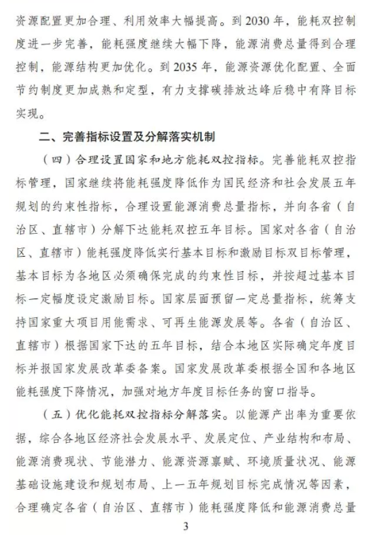 《方案》提出,到2025年,能耗雙控制度更加健全,能源資源配置更加合理、利用效率大幅提高。到2030年,能耗雙控制度進一步完善,能耗強度繼續(xù)大幅下降,能源消費總量得到合理控制,能源結構更加優(yōu)化。到2035年,能源資源優(yōu)化配置、全面節(jié)約制度更加成熟和定型,有力支撐碳排放達峰后穩(wěn)中有降目標實現(xiàn)。