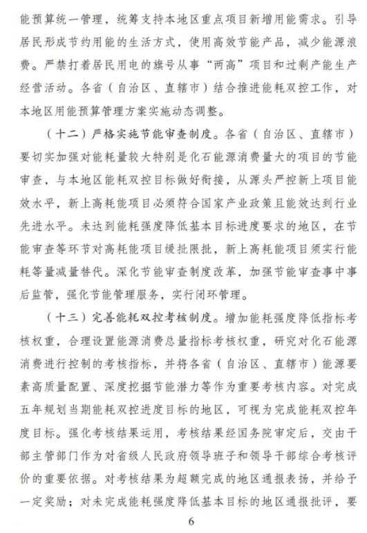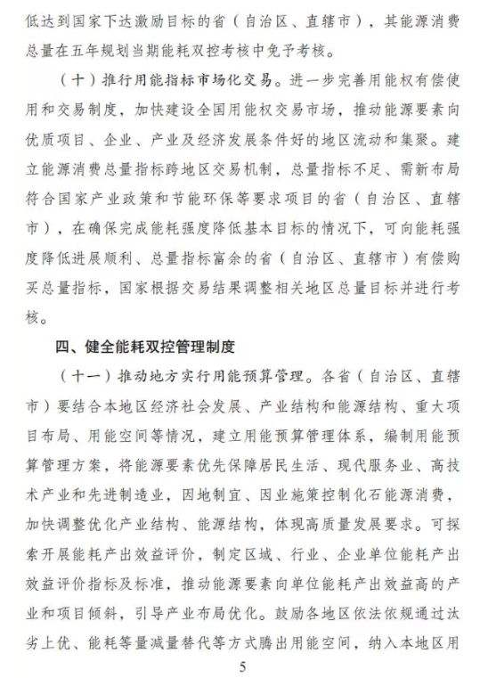 《方案》還提出,合理設置國家和地方能耗雙控指標。完善能耗雙控指標管理,國家繼續(xù)將能耗強度降低作為國民經濟和社會發(fā)展五年規(guī)劃的約束性指標,合理設置能源消費總量指標,并向各省(自治區(qū)、直轄市)分解下達能耗雙控五年目標。國家對各?。ㄗ灾螀^(qū)、直轄市)能耗強度降低實行基本目標和激勵目標雙目標管理,基本目標為各地區(qū)必須確保完成的約束性目標,并按超過基本目標一定幅度設定激勵目標。國家層面預留一定總量指標,統(tǒng)籌支持國家重大項目用能需求、可再生能源發(fā)展等。各省(自治區(qū)、直轄市)根據國家下達的五年目標,結合本地區(qū)實際確定年度目標并報國家發(fā)展改革委備案。國家發(fā)展改革委根據全國和各地區(qū)能耗強度下降情況,加強對地方年度目標任務的窗口指導。