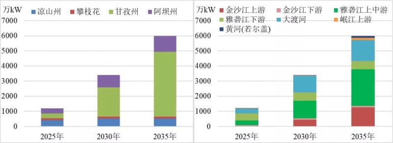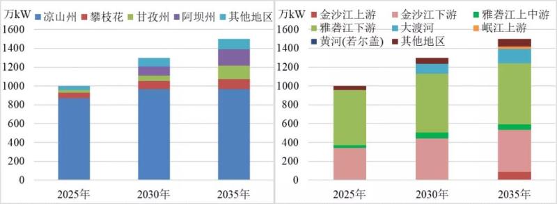 預計四川省2030年、2035年水電裝機達到1.22、1.24億千瓦,開發(fā)程度達82.0%和83.5%;2030年水電開發(fā)接近完成,2035年基本開發(fā)完畢。預計2030年、2035年省內消納新能源可達4700萬千瓦和7500萬千瓦左右。從區(qū)域上看,2030年涼山州風電基本開發(fā)完畢。2025年以后新增光伏主要分布在甘孜州和阿壩州,2035年光伏主要集中在甘孜州,新增新能源多分布在流域上游水電較少地區(qū)。