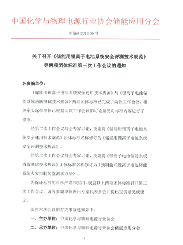 經(jīng)第二次工作會(huì)議與會(huì)專家討論,決定將《儲(chǔ)能用鋰離子電池系統(tǒng)安全通用技術(shù)規(guī)范》團(tuán)體標(biāo)準(zhǔn)名稱修訂為《儲(chǔ)能用鋰離子電池系統(tǒng)安全評(píng)測(cè)技術(shù)規(guī)范》。