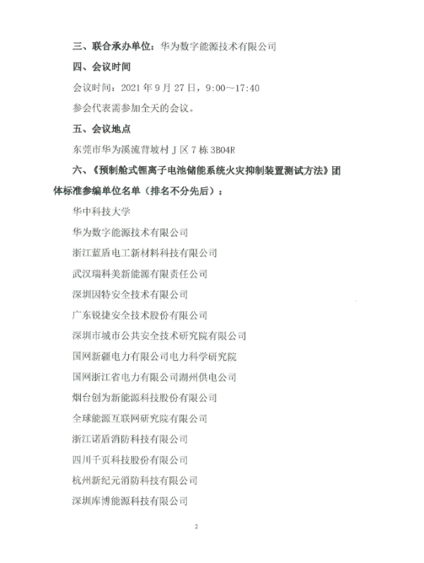 經(jīng)第二次工作會(huì)議與會(huì)專家討論,決定將《鋰離子電池儲(chǔ)能系統(tǒng)消防測(cè)試技術(shù)規(guī)范》團(tuán)體標(biāo)準(zhǔn)名稱修訂為《預(yù)制艙式鋰離子電池儲(chǔ)能系統(tǒng)火災(zāi)抑制裝置測(cè)試方法》。