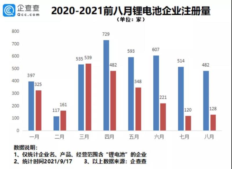 2021年1-8月,國(guó)內(nèi)新增鋰電池相關(guān)企業(yè)共2324家,同比下滑41.5%。