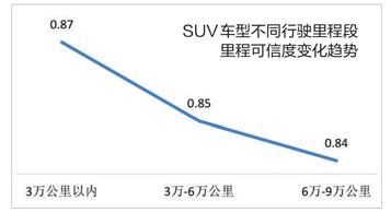 聯(lián)盟還特意將轎車與SUV分開進行了比較,結果顯示,相比轎車,SUV車型的里程可信度略低一些。累計行駛里程3萬公里以內(nèi)、3萬~6萬公里、6萬~9萬公里三個階段,SUV的平均里程可信度分別為0.87、0.85、0.84。
