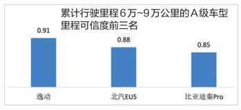 不過,當累計行駛里程超過6萬公里時,A級車的平均里程可信度出現(xiàn)一定程度下降,降至0.86。里程可信度排名前三的車型為逸動、北汽EU5和比亞迪秦Pro,依次為0.91、0.88和0.85。