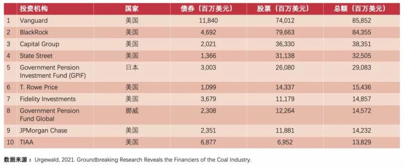 截至2021年1月,美國(guó)投資者在全球煤炭行業(yè)持有的股票和債券總價(jià)值6020億美元,合計(jì)占全球煤炭行業(yè)機(jī)構(gòu)投資的58%,其中以共同基金公司先鋒領(lǐng)航集團(tuán)(Vanguard)的860億美元和資產(chǎn)管理公司貝萊德集團(tuán)(BlackRock)的840億美元為首,日本和英國(guó)的投資者在全球煤炭行業(yè)的機(jī)構(gòu)投資中所占份額分別位居第二和第三位(見下表)。
