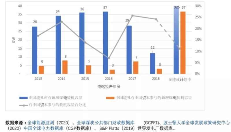 2013-2018所有中國(guó)境外新增煤電裝機(jī)容量與其中中國(guó)資本參與的煤電裝機(jī)容量
