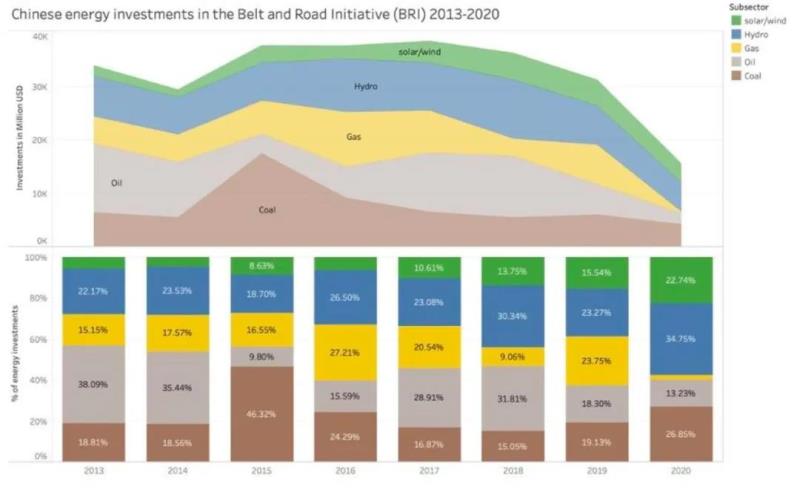 2013-2020中國(guó)在一帶一路國(guó)家能源投資的種類分布,圖標(biāo)自上而下為:風(fēng)能/光能,水能,天然氣,石油,煤炭。來源:CUFE