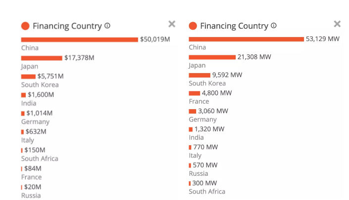 國(guó)際煤電項(xiàng)目主要公共資金來源國(guó)及支持規(guī)模和容量,單位:百萬美元、兆瓦,數(shù)據(jù)來源:GCPFT