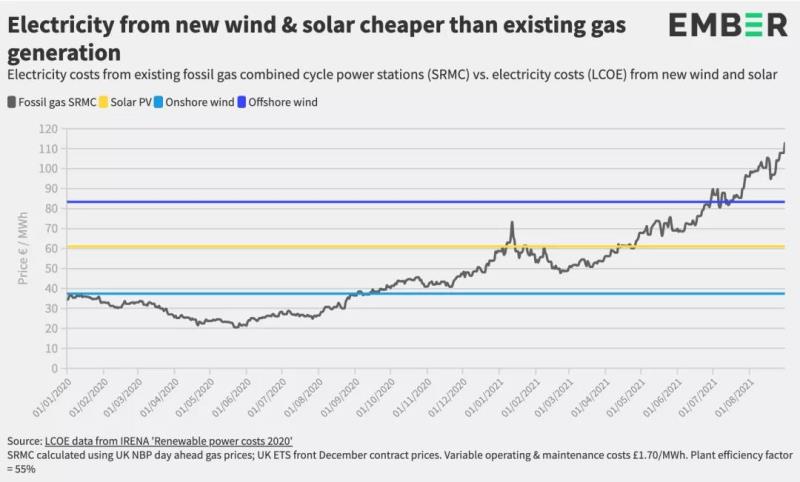 避免天然氣波動的唯一辦法是加速向清潔電力的過渡,因為風(fēng)能和太陽能不會受到燃料成本市場波動的影響。根據(jù)國際可再生能源署最新發(fā)布的數(shù)據(jù),英國現(xiàn)有天然氣發(fā)電廠的發(fā)電成本是新建陸上風(fēng)電發(fā)電成本的三倍,幾乎是新建太陽能發(fā)電成本的兩倍。即使是新建海上風(fēng)電的平準(zhǔn)成本(LCOE)目前也比天然氣氣發(fā)電便宜。即便不考慮碳價,天然氣發(fā)電成本仍然比風(fēng)能和太陽能更昂貴。