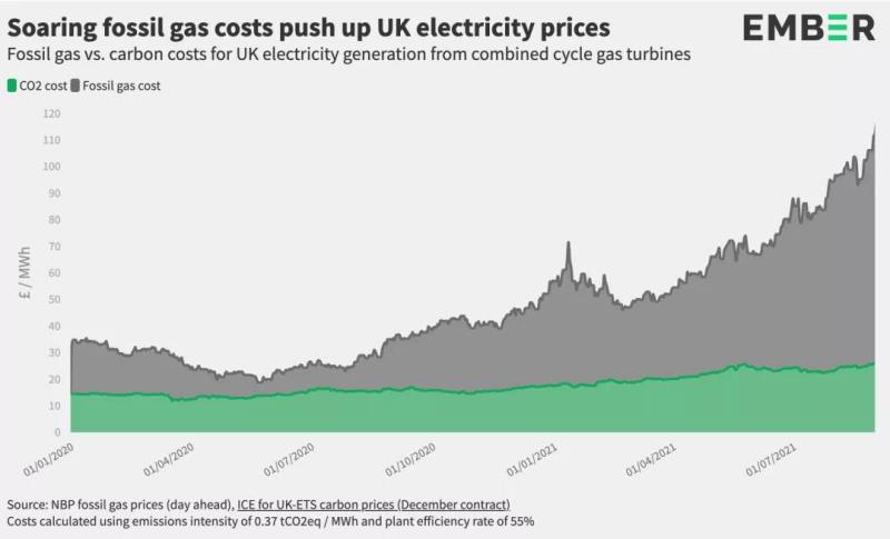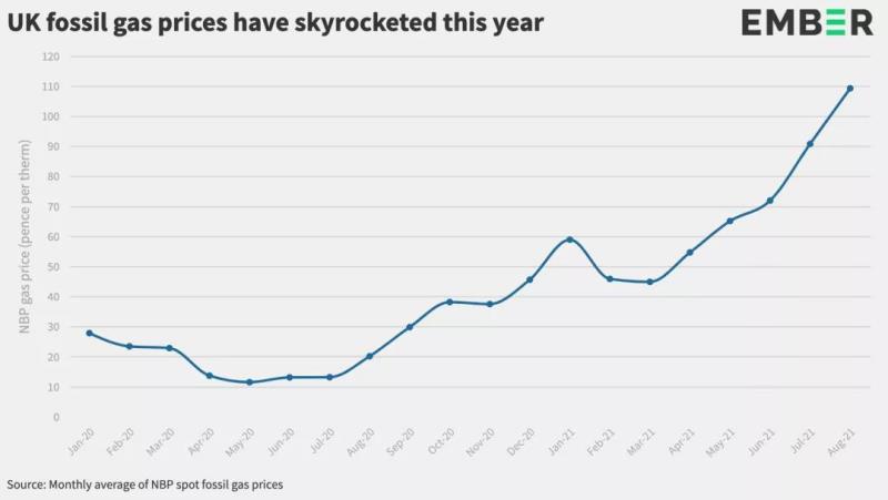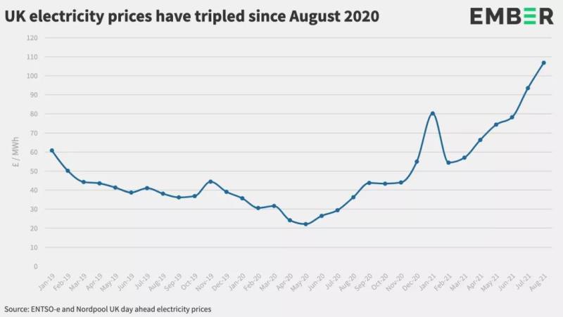 咨詢機構(gòu)Ember的最新分析顯示,英國的電價在過去一年上漲了兩倍。電價飛漲是多種因素共同作用的結(jié)果:北半球寒冷的冬季耗盡了天然氣儲存;亞洲需求和價格的增加導(dǎo)致液化天然氣運往亞洲而不是歐洲;隨著新冠病毒限制的解除,全球經(jīng)濟反彈市場天然氣需求增加;從俄羅斯經(jīng)由烏克蘭進口的天然氣尚未啟動,不能滿足歐洲需求的增長。